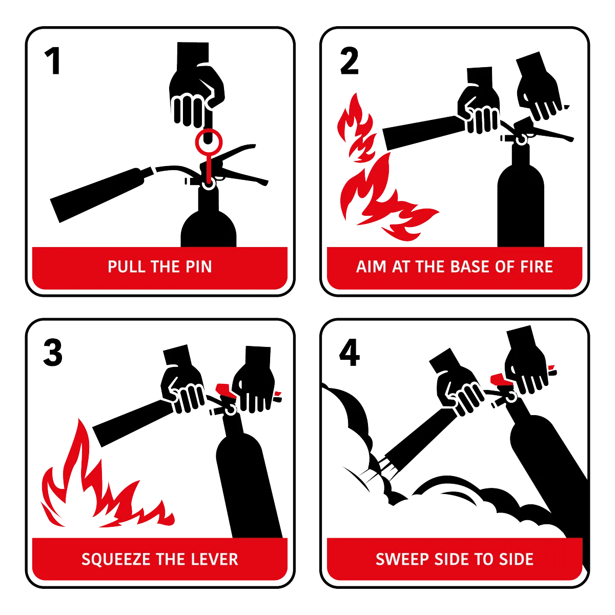 Demonstrate how to extinguish a fire using the PASS technique (pull, aim, squeeze, sweep)