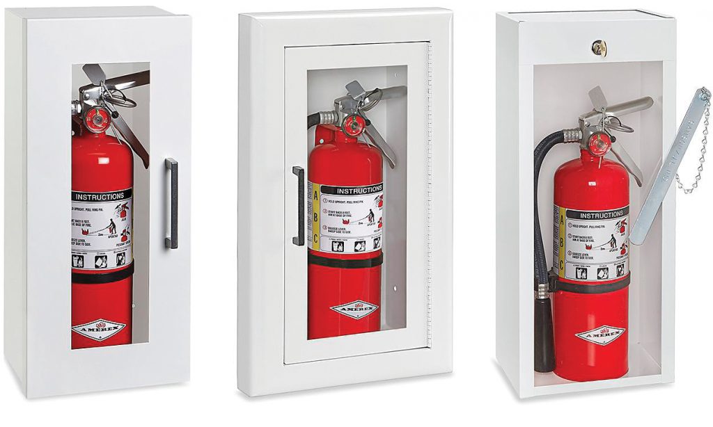 To prevent fire extinguishers from being moved or damaged, they should be mounted on brackets or in wall cabinets with the carrying handle placed 3-1/2 to 5 feet above the floor. Larger fire extinguishers need to be mounted at lower heights with the carrying handle about 3 feet from the floor.
